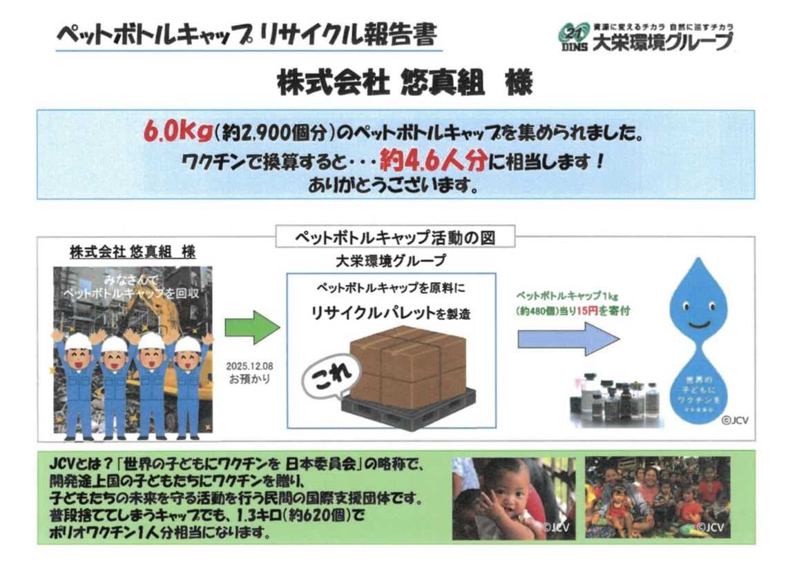 その結果、6.0kg(約2,900個分)のペットボトルキャップを回収することができ、ワクチンに換算すると約4.6人分に相当するとのことでした👏✨
